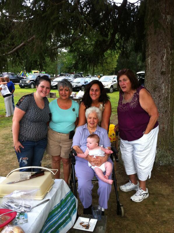 Five generations- from left Great niece Jade, me, Niece Tanya, my sister Anne Marie, My mother and great grand niece Iszabella