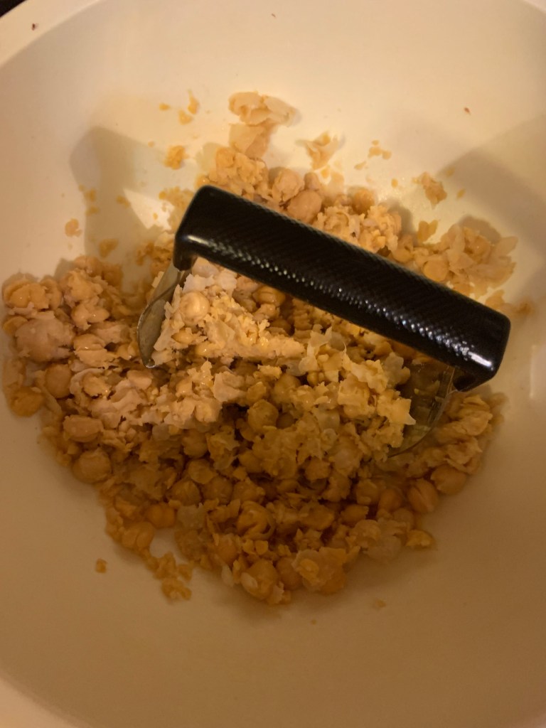 Cook the carrots and onions in a pan with a drizzle of olive oil until soft, then salt them. Meanwhile mash the chickpeas, add pepper and garlic powder, then the mustard. Once the vegetables are cooked, add to the chickpea mixture, and mix well. Using a pastry cutter works great to make sure everything is mixed well. Form into a regular shape, then cook in a pan with about a tablespoon of olive oil, for about 4-5 minutes per side until a golden crust forms on the surface. Serve hot. I made six burgers with this recipe.