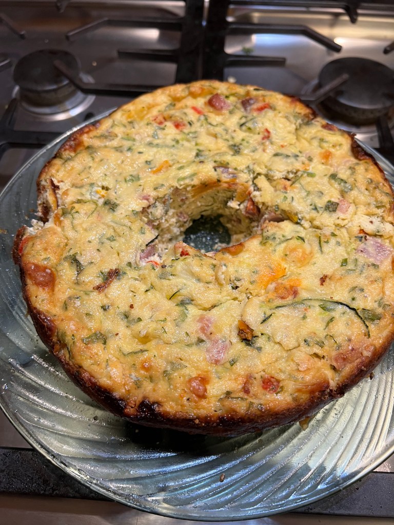 When you have friends with gardens that are overflowing with zucchini, you just have to step in and help. I made stuffed zucchini, zucchini frittata, zucchini bread, fried zucchini flowers, and roasted zucchini. I started to look for something new and different to make with this versatile squash. I found a recipe in one of my recipes sites and decided to try it out. Now usually, I look at the recipe and I adjust it automatically, but this time I decided to make it as it was written. Well, the consensus of my taste testers was that it was just okay, the texture was fine, the mint was overpowering, and it just didn’t have enough zest. I decided to use almond flour this time to make it gluten free and add a different texture, I increased the cold cuts, ricotta, mozzarella, and used a combination of basil and parsley. The results of this version were well received and deemed a winner. Ciambella in Italian translates to donut, so this is a savory donut cake. It’s best served cold or room temperature and make sure it’s cool completely before removing from the tube pan. (a lesson I learned the hard way, good thing I know how to piece things together!)