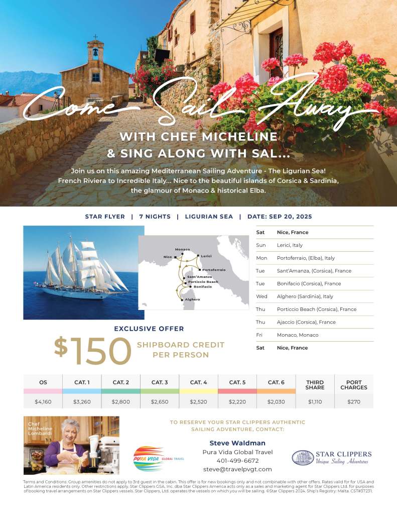 Come join me on my Celebrity Chef tour in September 2025 as we cruise the Ligurian Sea! We sail from Nice, France to the beautiful islands of Corsica and Sardinia stop at Portoferraio, Italy and check out the glamourous Monaco. I will be cooking on the deck of the Star Flyer Tall ship and as a special treat, my husband Sal will be entertaining you with songs from the 50’ & 60’s. This is my second Celebrity Cruise on the Star Clipper Line. Check out some of the photos of the first cruise.